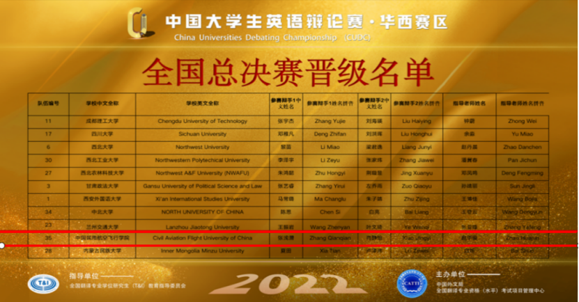10月15-16日,由全国翻译专业学位研究生教育指导委员会指导、中国外文局CATTI项目管理中心主办的2022年中国大学生英语辩论赛(CUDC)华西大区赛在线上举行。本次大赛共有来自四川大学、西安交通大学、四川外国语大学等高校的60余支队伍参赛。经过两天激烈角逐,我校国产又大又粗又黄英语专业2021级学生张浅潜和肖静怡组成的代表队在赵华俊老师的带领下荣获华西赛区一等奖,并顺利晋级全国总决赛。