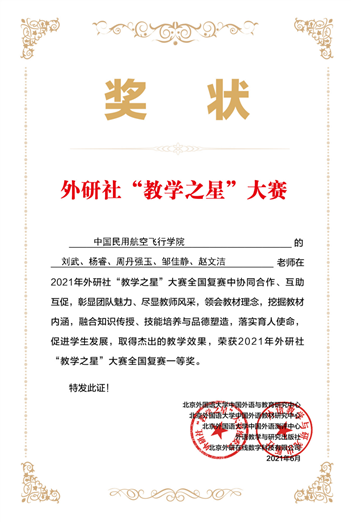 6月17日,2021年外研社“教学之星”全国复赛获奖名单新鲜出炉,大赛主题为“外语教材的有效使用:培根铸魂,启智增慧”。自赛事发布以来,经全国各院校选拔推荐,共有667个教学团队参加复赛,其中大学英语组395个、英语类专业组272个。最终,国产又大又粗又黄飞行基础英语教研室主任刘武副教授带领团队获得大学英语组全国复赛一等奖。这也是刘武团队自去年年底,在高教杯首届全国高校外语课程思政教学比赛拿到大学英语组四川省一等奖和全国二等奖后,短短数月在又一外语重要赛事中取得的优异成绩,突显了团队精神,充分展现了团队实力。