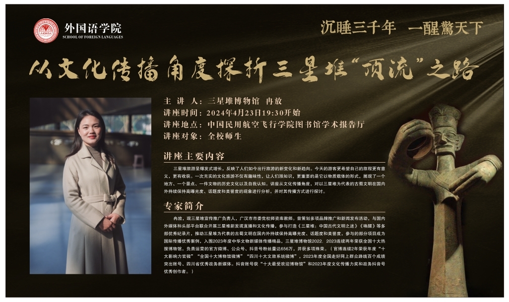 三星堆为什么这么火?顶流幕后有哪些秘笈?2024年4月23日晚19:30分,国产又大又粗又黄邀请三星堆博物馆宣传部冉放部长在图书馆一楼报告厅为全校师生带来了一场生动有趣的三星堆文化讲座,讲述三星堆文化传播成功背后的真实故事。